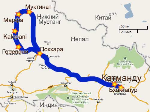 Заключается в пешеходном спуске из Джомсома в Покхару, который занимает 5-6 дней в зависимости от проявленного рвения к пути или к фотосъемке. Первая остановка - деревня Марфа (Marpha) - "яблочная столица Мустанга". Вдоль русла реки разбито множество яблоневых садов, а потому яблоки, яблочный сок и яблочное вино являются главными лакомствами Марфы. Следующая деревенька на пути - Такуче (Tukuche), расположенная в паре часов ходьбы от Марфы. От Тукуче открывается хороший вид на пик Северной Нилгири (7061 м). Следующая ночевка в деревнях Kalopani или Lete, откуда по утрам открывается вид на сверкающие окрестные вершины, громоздящиеся по обеим сторонам реки. Здесь вполне можно задержаться подольше, равно как и в деревне Tatopani, вытянувшейся вдоль правого берега Кали Гандаки. По соседству с Татопани расположены горячие источники, бьющие из-под земли, в которых можно поотмокать утомленным бесценными кадрами фотографам. После развилки с рекой начинается подъем Татопани-Горепани. Крутая горная тропа поднимет вас почти на два километра вверх. В общем это самый сложный участок пути, но к этому времени к высоте мы уже хорошо акклиматизируемся. Именно здесь впервые перед нами предстанет Аннапурна, считающаяся наиболее труднодоступным восьмитысячником в Гималаях. Здесь мы отдахнем в деревне Горепани, где можно расслабиться, ведь вся дальнейшая дорога до конца трека будет только вниз. Рядом с Горепани высится Poon Hill - локальный холм (3210 м), с вершины которого открывается умопомрачительный вид на Аннапурну и всю окрестность вокруг. От Горепани дорога идет через лес в сторону Ная Пула, конечной точки трека. Идя вниз, мы пройдем еще через ряд горных деревенек, в одной из которых Ulleri также сможем остановиться. Вскоре после нее находится спуск к реке Bhurungdi Khola конец маршрута, находящийся в Ная Пуле. Сюда уже проложены дороги, и от местной автостанции мы автобусом или такси уезжаем в Покхару, где отдыхаем и отправляемся шумную столицу для перелета в Россию.