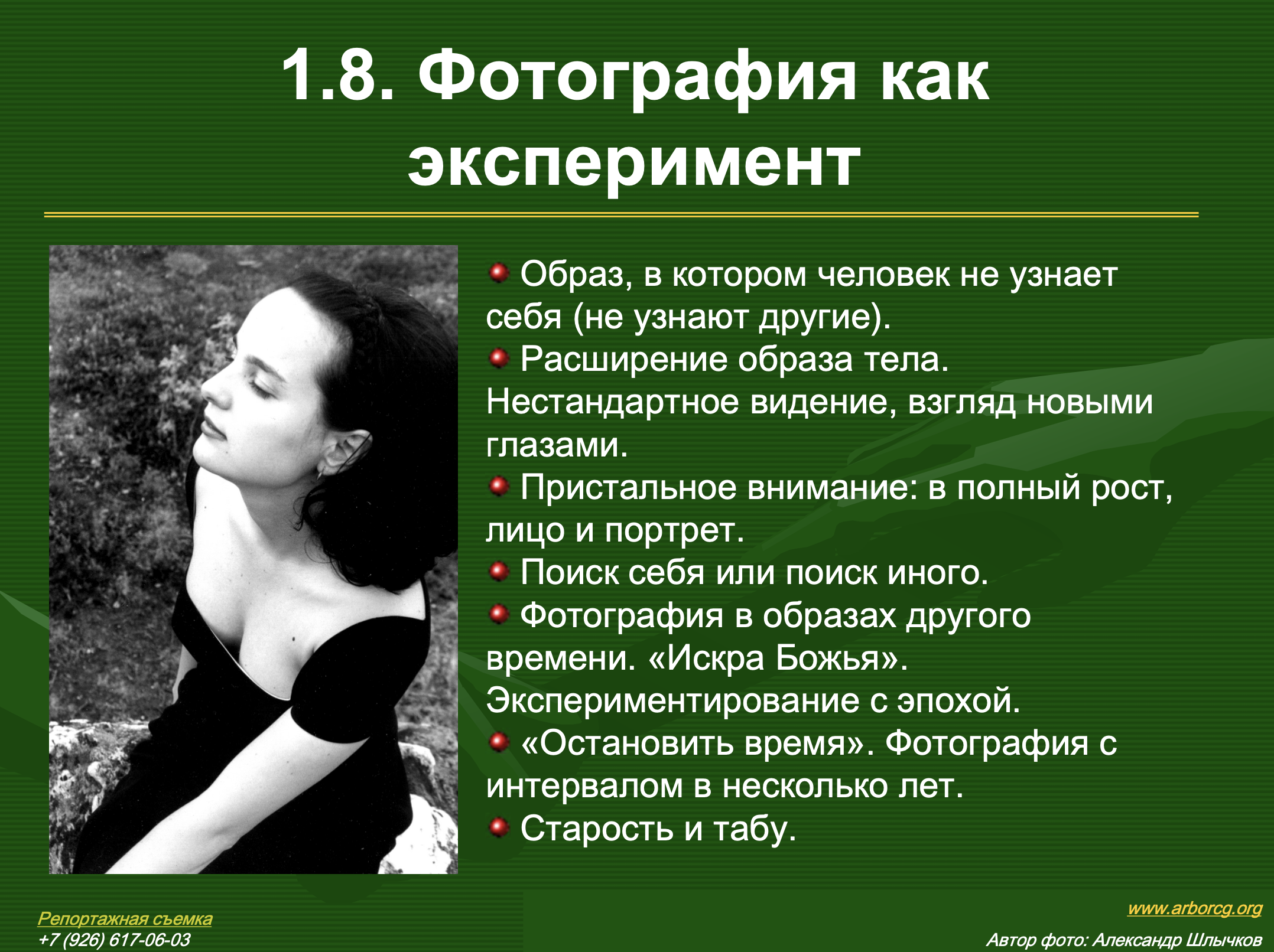 - Фотография как эксперимент. Образ, в котором человек не узнает себя (либо в котором его не узнают другие). Расширение образа своего тела. Крупный план и пристальное внимание: в полный рост, лицо и портрет. Нестандартное видение, взгляд новыми глазами. Поиск себя или поиск иного. Фотография в образах другого времени. 'Искра Божья'. Экспериментирование со временем и эпохой. 'Остановить время'. Фотография с интервалом в несколько лет. Старость и табу.