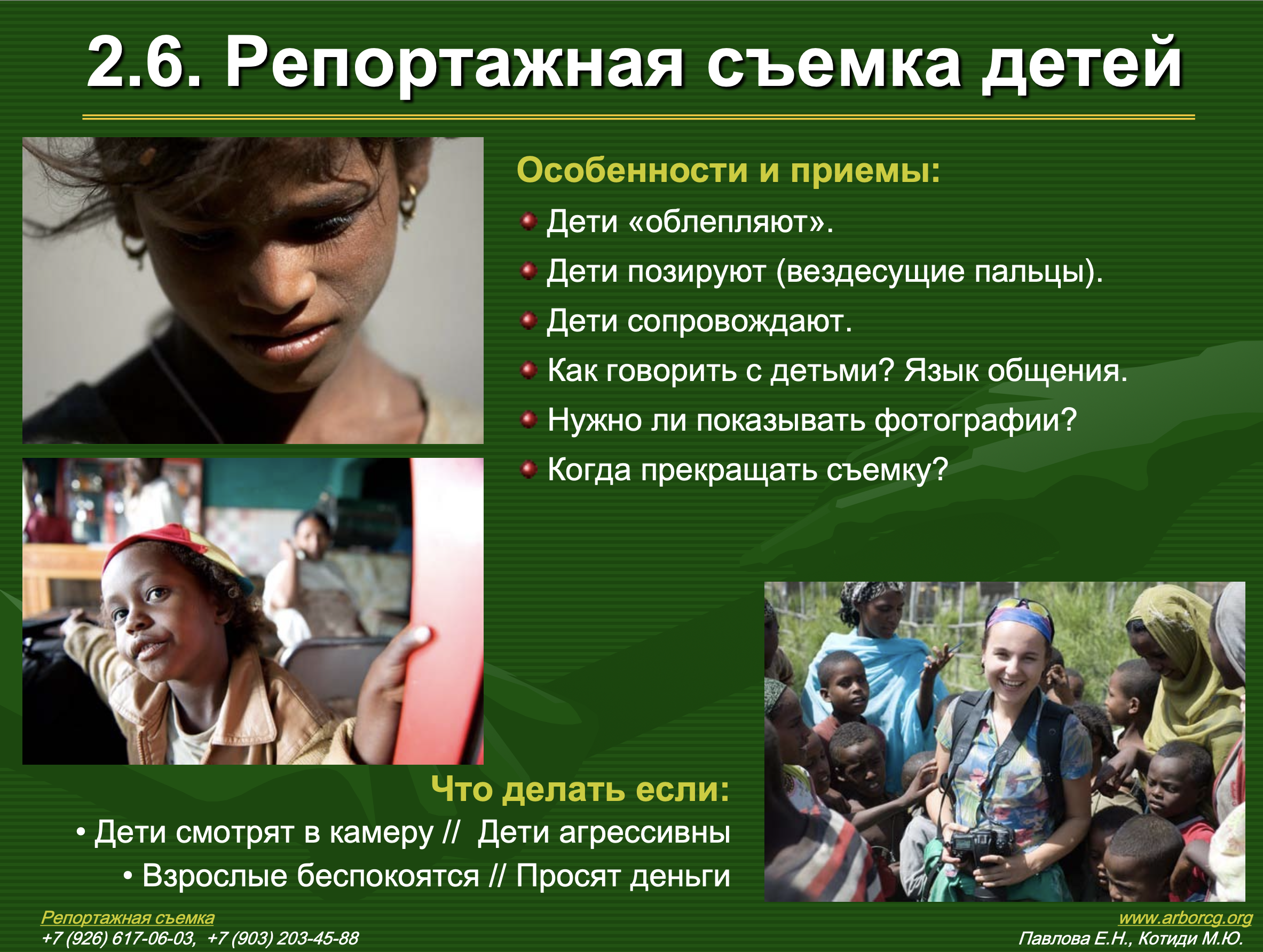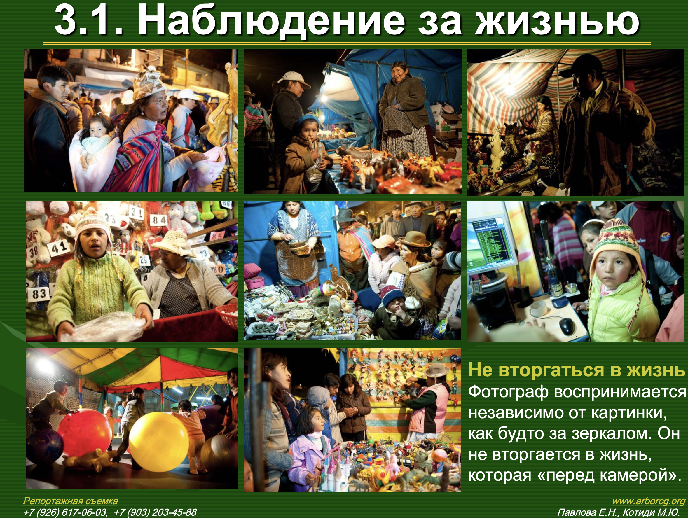 - Съемка со вступлением в контакт. Когда и как спрашивать разрешения о съемке. Съемка на очень близкой дистанции. Съемка работающих людей и групп. Постепенное сближение при повторной съемке. Работа со сближением и поддержанием контакта в ситуации парного взаимодействия с моделью. Умение найти подход. Демонстрация авторитета и установление контакта на равных.