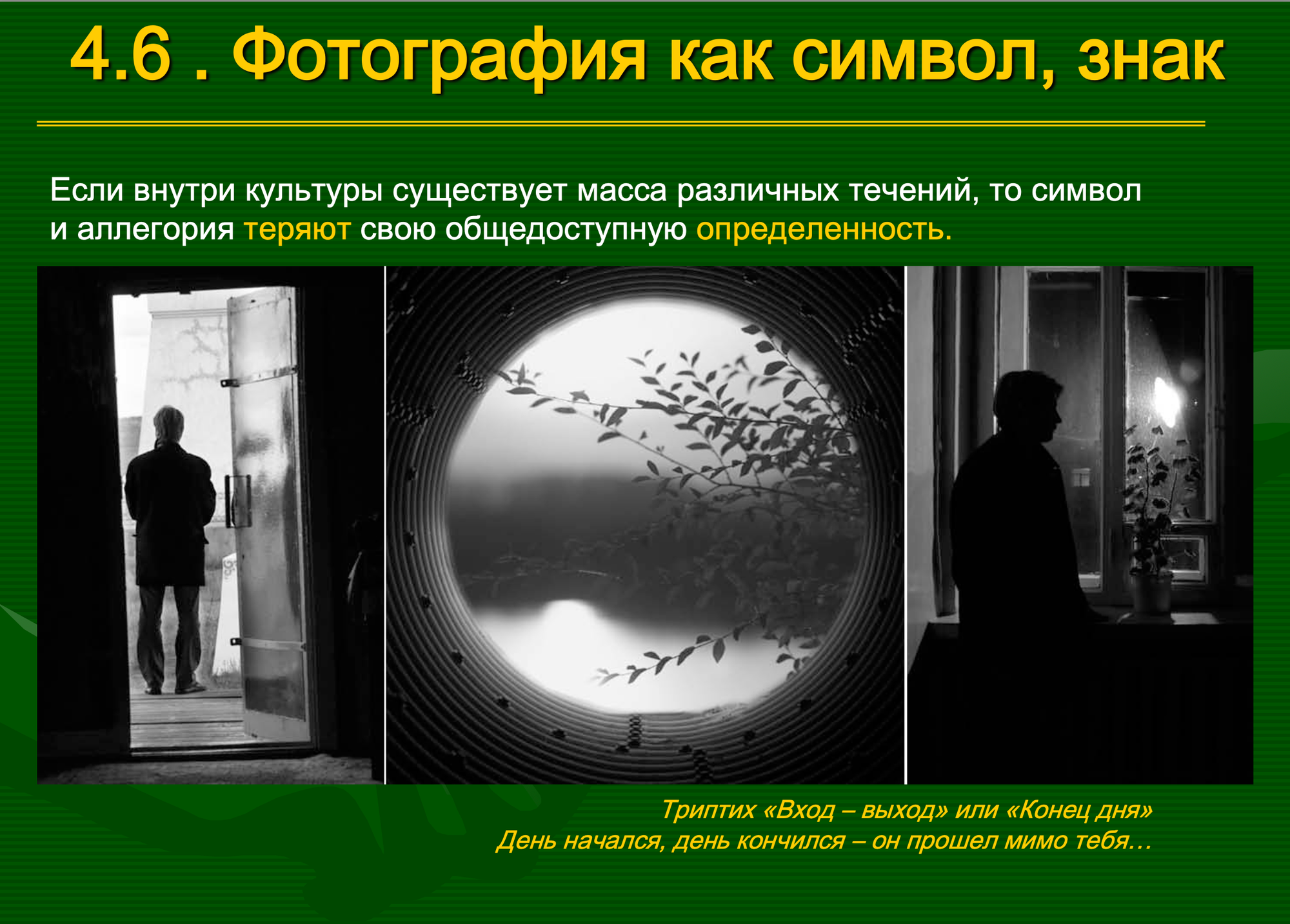 - Личный смысл. Жанровая фотография или 'жизнь врасплох'. Инверсия смыслов: фотографировать значительное или делать значительным то, что сфотографировано? Съемка того, что нельзя увидеть глазами. Отказ от утилитарных целей. Утилитарная (информационная) и 'очеловеченная' репортажная фотография. Оживление фотографии и вчитывание смыслов. Детали, заполняющие собой фотографию - вне связи с основным сюжетом (то, что 'наносит укол'), невольный штрих. Смещение фокуса внимания. Кодирование смысла (запаздывание и молчание). Слепое поле. Вглядывание.
