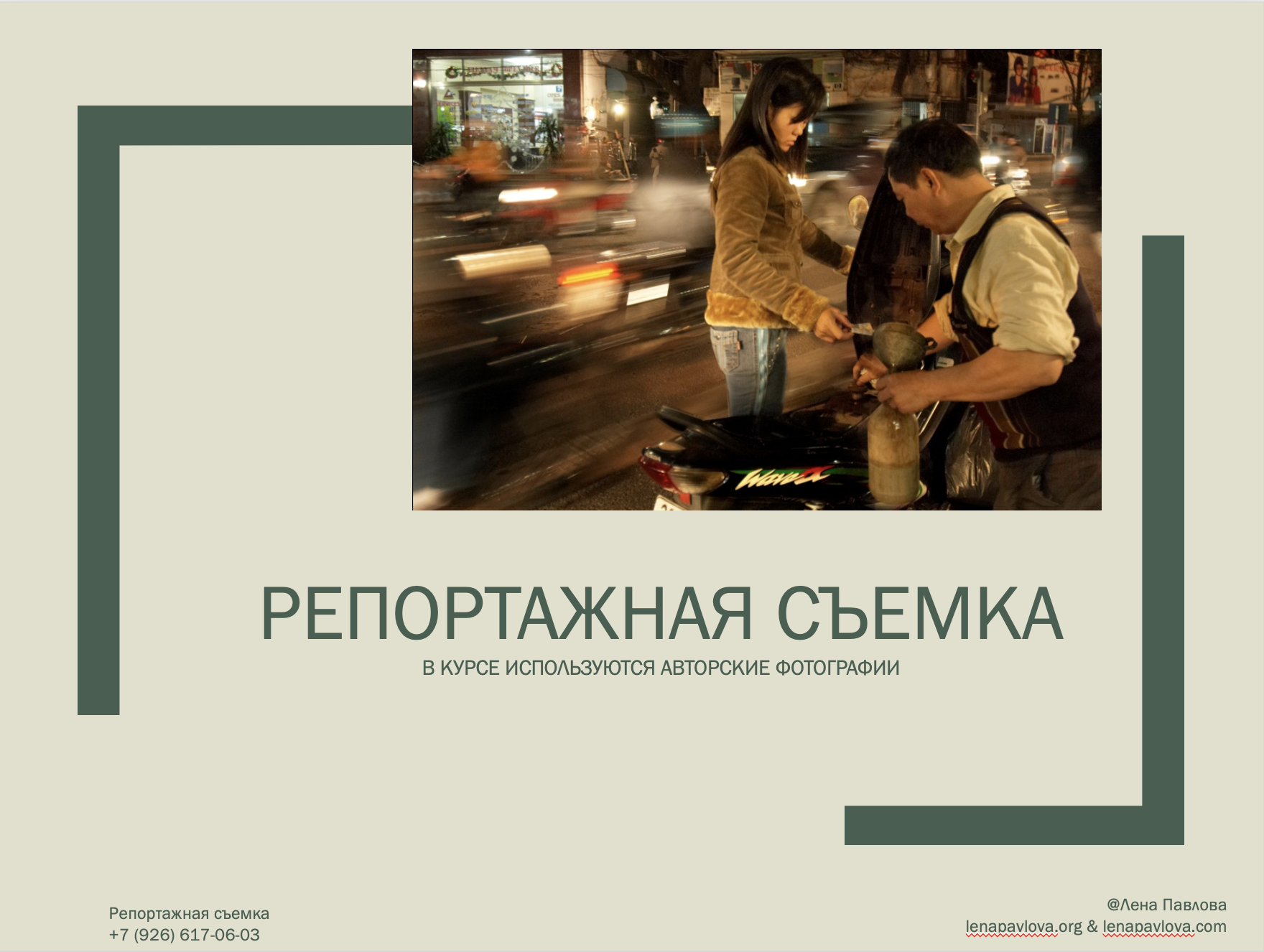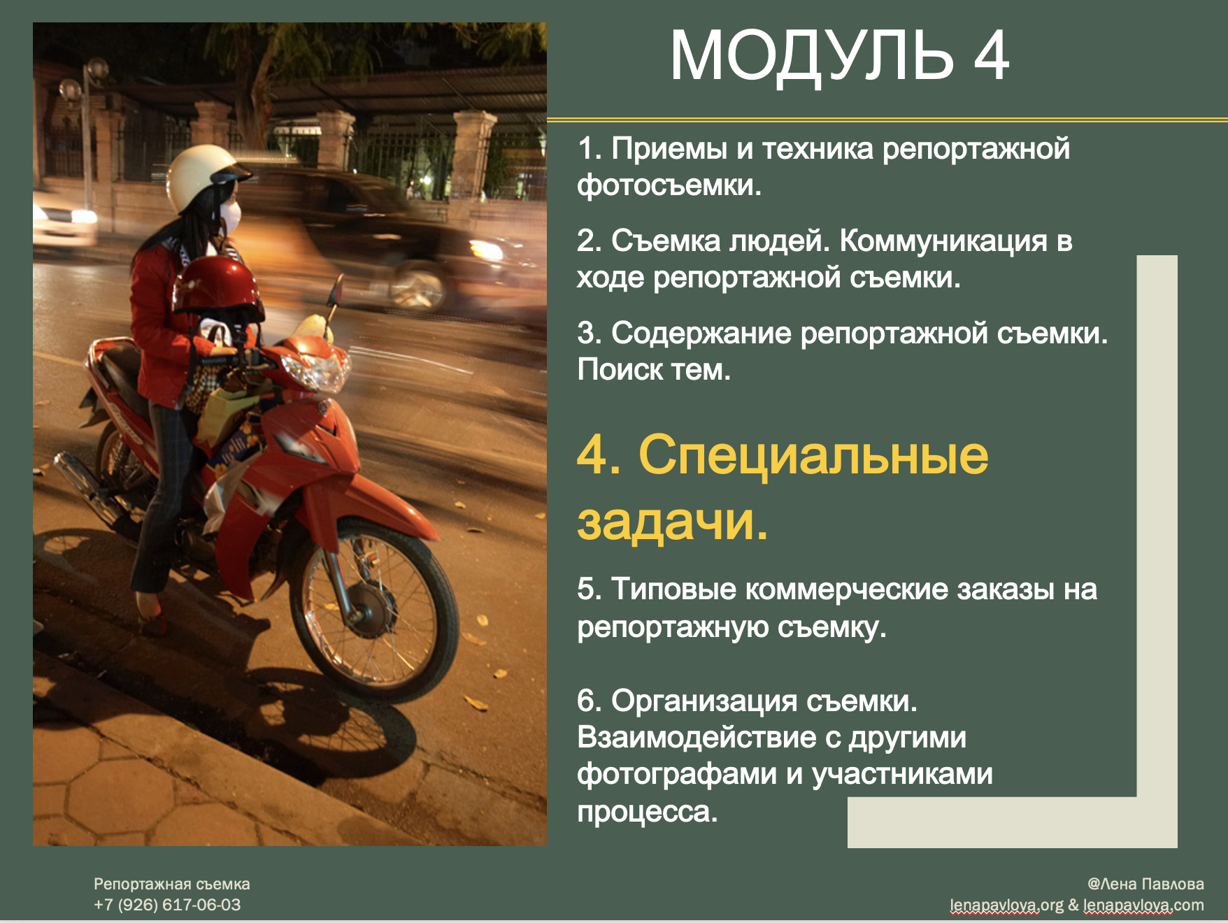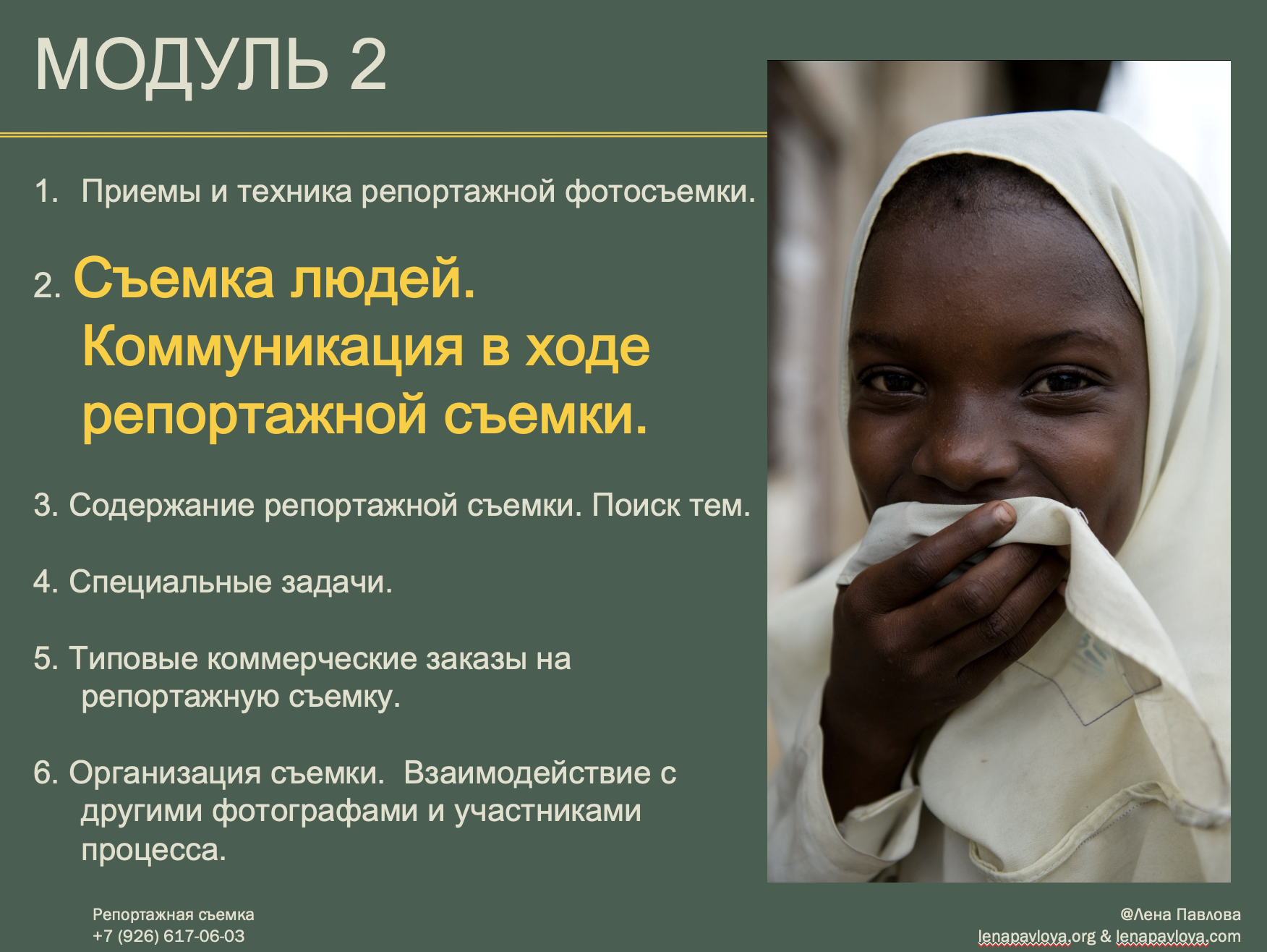Курс включает приемы и технику коммерческой (и творческой) репортажной съемки, психологические основы съемки людей. Курс для тех, кто переходит от любительской съемки к профессиональной или тех, кому приходится решать близкие профессионалам задачи (например, осуществлять в своих компаниях съемку мероприятий). Для продвинутых любителей, развивающих и совершенствующих свой уникальный стиль. Используется индивидуальное или парное обучение, настроенное под задачи и исходный уровень обучающегося.