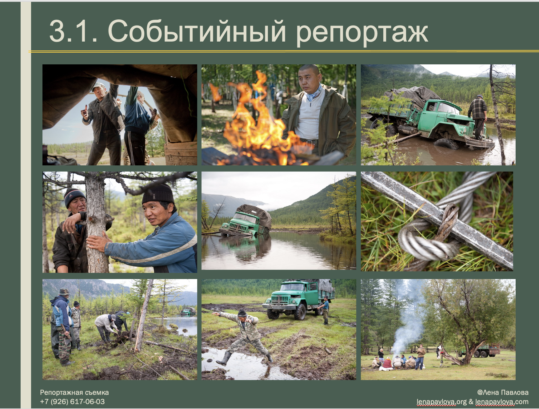 - Фотопутешествия и фотоэкспедиции. Поездки или путешествия небольшой группы фотографов с целью съемки. Обычно организуются вокруг тематического маршрута в нетуристических местах. Позволяют научиться репортажной съемке и тревел фотографии в ходе поездки (ежедневная съемка и просмотр), узнать страну в ходе глубокого погружения, развить свои коммуникативные и социальные навыки при взаимодействии с местными жителями. Съемка на выезде. Особенности экипировки, расчет съемочных условий, взаимодействие с агентствами и изданиями (презентация и представление результатов).