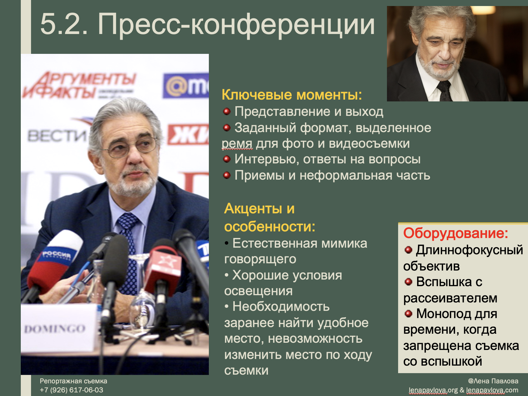 - Пресс-конференции. Презентации. Характерна высокая конкуренция среди фотографов (съемка в толпе). Необходимо знание площадки. Сочетание общих планов и портретов. Жанровые фотографии в коммерческом заказе.